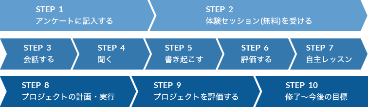 10ステップを丁寧に進み、振り返り、セッション外も随時フィードバックを受けるなど、コーチとの二人三脚で英語学習に取り組むことで、自分が本当に求めていることを見つけ、それに合った学び方を体得します。始める前には想像しにくいですが、勇気をもって踏み出した後には思いもよらない展開が待っているかもしれません。You 2.0(新バージョンのあなた)を目指します。