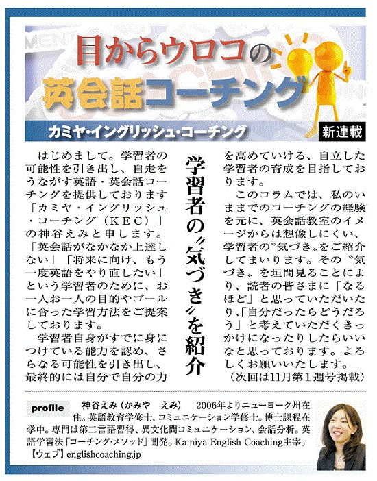 このコラムでは、私のいままでのコーチングの経験を元に、英会話教室のイメージからは想像しにくい、学習者の“気づき”をご紹介してまいります。その“気づき”を垣間見ることにより、読者の皆さまに「なるほど」と思っていただいたり、「自分だったらどうだろう」と考えていただくきっかけになったりしたらいいなと思っております。よろしくお願いいたします。